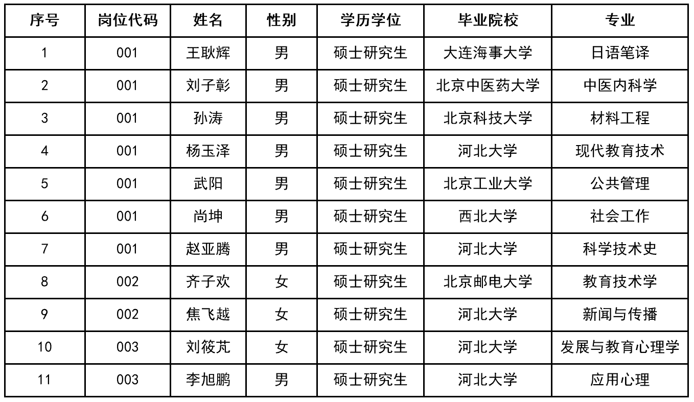 根據(jù)《河北省事業(yè)單位公開(kāi)招聘工作人員暫行辦法》和《河北大學(xué)2022年公開(kāi)招聘專(zhuān)職輔導(dǎo)員公告》,經(jīng)網(wǎng)上報(bào)名、資格初審、線上筆試、資格復(fù)審、綜合能力考核、基本素質(zhì)考核、心理測(cè)試、體檢、考察等程序,確定以下11人為我校專(zhuān)職輔導(dǎo)員擬聘人員,現(xiàn)予以公示: