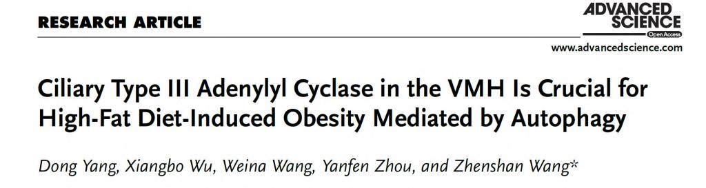 近日,河北大學生命科學學院王振山教授團隊在國際主流期刊《Advanced Science》在線發(fā)表了題為“Ciliary Type III Adenylyl Cyclase in the VMH Is Crucial for High-Fat Diet-Induced Obesity Mediated by Autophagy”的研究論文。該研究揭示了腺苷酸環(huán)化酶3(AC3)基因在小鼠下丘腦神經(jīng)細胞纖毛部位的表達對高脂肪飼料誘導的肥胖有重要的調(diào)控作用。