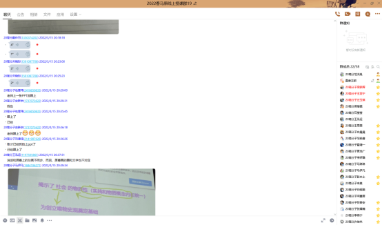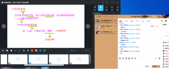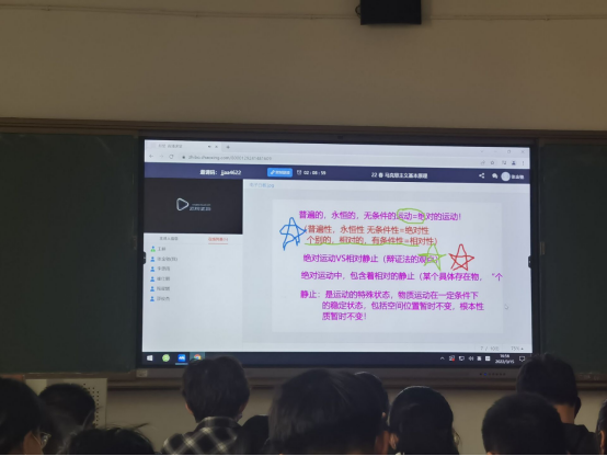 在課堂教學(xué)階段,課前10分鐘發(fā)送直播間鏈接給學(xué)委,學(xué)委在操作臺電腦打開瀏覽器即可進(jìn)入直播間;同時,在學(xué)習(xí)通平臺發(fā)起拍照簽到,要求學(xué)生在教室環(huán)境自拍,保證出勤率。伴隨著上課鈴聲,王耕老師的《馬克思主義基本原理》課開講了,老師一邊講授課程內(nèi)容,一邊在直播間白板上同步書寫著板書,并隨時標(biāo)記著重點難點,學(xué)生則認(rèn)真地記著筆記。筆記對于課程學(xué)習(xí)非常重要,除了課上用心聽、用心記,還需要課后認(rèn)真思考、回憶、反思和拓展學(xué)習(xí)。王耕老師始終把培養(yǎng)學(xué)生良好的學(xué)習(xí)習(xí)慣當(dāng)作一項重要的教學(xué)任務(wù),因此不遺余力地每堂課認(rèn)真書寫板書,課下培養(yǎng)和挖掘好的筆記給大家做示范,學(xué)生也都能夠認(rèn)真地完成。“靡不有初,鮮克有終”,長此以往,班級形成積極向上的尚學(xué)風(fēng)氣,即使在線上教學(xué)期間,也依然能夠很好保持。