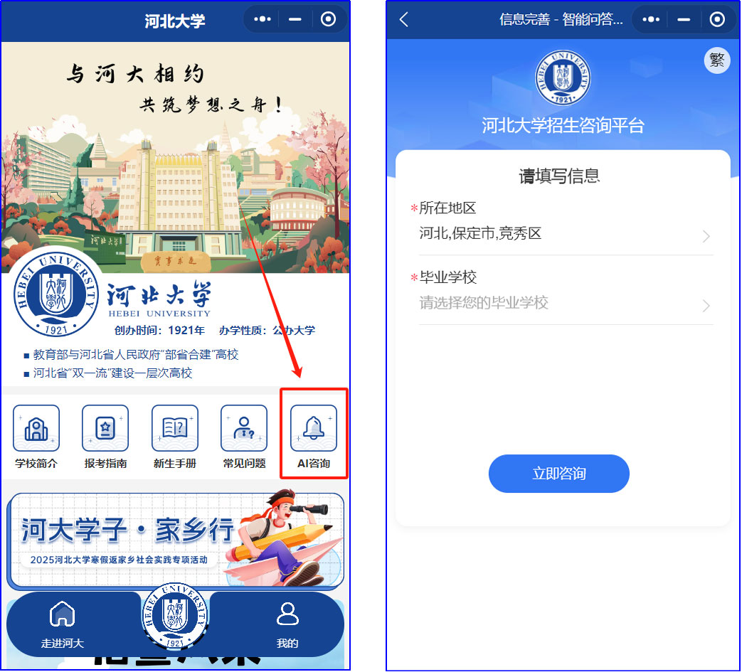 進入“【河北大學本科招生】”小程序主頁面,點擊AI咨詢,跳轉至問答頁即可進行提問。