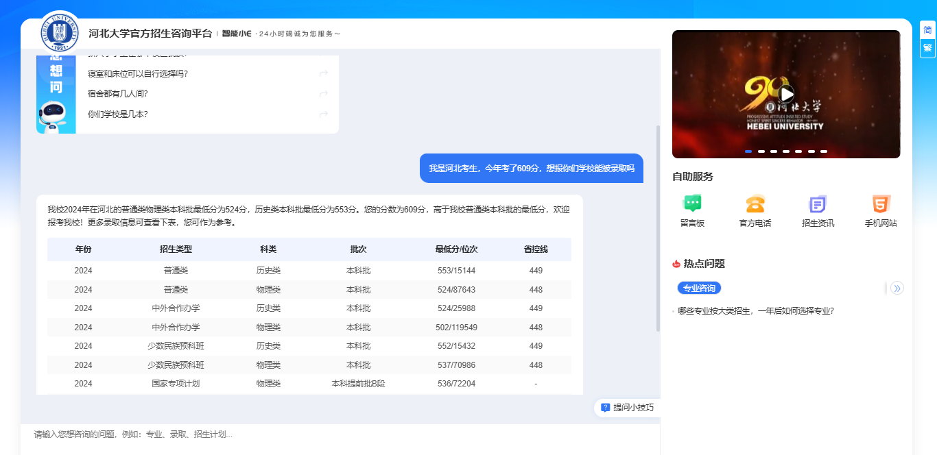 問答示例:當你問“我是河北考生,今年考了609分,想你們學校能被錄取嗎”時,系統不僅能通過DeepSeek大模型技術精準識別你的咨詢意圖是:省份、分數、錄取分數,還會結合歷年錄取數據,為你提供更有參考性的回復!