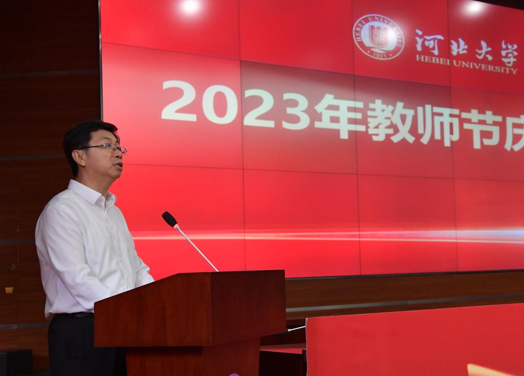 黨委書記郭健在講話中代表學(xué)校黨委,向退休教師致以崇高敬意,向獲獎(jiǎng)教師表示熱烈祝賀,向新入職教師表達(dá)美好祝福,向全校廣大教師致以節(jié)日的問候。他向與會(huì)師生介紹了學(xué)校過去一年在人才培養(yǎng)、學(xué)科建設(shè)、科學(xué)研究、社會(huì)服務(wù)等工作中取得的成績(jī),表示學(xué)校辦學(xué)事業(yè)的高質(zhì)量發(fā)展,凝聚著每一位教師的智慧力量、心血汗水。他強(qiáng)調(diào),要把加強(qiáng)教師隊(duì)伍建設(shè)作為最重要的基礎(chǔ)工作來抓,扎實(shí)推進(jìn)“人才強(qiáng)校”戰(zhàn)略,實(shí)施一流師資建設(shè)工程,堅(jiān)持“以師生為本”工作理念,用心用情致力于讓廣大教師在河北大學(xué)工作順心、生活開心,安心從教、熱心從教。他希望,全校廣大教師要心懷“國(guó)之大者”,自覺做習(xí)近平新時(shí)代中國(guó)特色社會(huì)主義思想的堅(jiān)定信仰者和忠實(shí)實(shí)踐者,堅(jiān)持為黨育人、為國(guó)育才,培養(yǎng)更多德智體美勞全面發(fā)展的社會(huì)主義建設(shè)者和接班人;要涵養(yǎng)道德學(xué)識(shí),努力做“經(jīng)師”“人師”相統(tǒng)一的大先生,用大愛書寫教育人生;要融入學(xué)校發(fā)展,積極做一流大學(xué)的建設(shè)者,發(fā)揚(yáng)“主人翁”精神,心系“強(qiáng)校之夢(mèng)”、肩扛“強(qiáng)校之責(zé)”,在部省合建平臺(tái)上推動(dòng)學(xué)校“雙一流”建設(shè)不斷取得新成效。