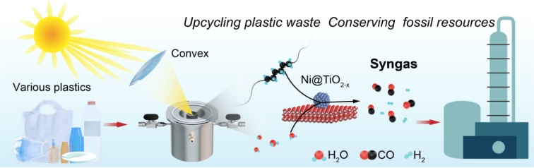 當前,非降解性廢棄塑料在生態系統中長期滯留已造成嚴重的環境污染。通過催化轉化處理技術對這些含碳氫廢棄物進行再生利用,不僅有助于緩解環境壓力并推動污染治理,更能實現碳基資源的高效循環,在降低化石能源消耗量的同時促進循環經濟發展。鑒于此,研究團隊通過合理設計催化劑,利用富含氧空位的二氧化鈦負載鎳作為催化劑,利用光熱催化技術實現了廢塑料濕法重整制備合成氣(氫氣和一氧化碳)的反應,可為重要石油化工過程——費托合成提供原料。通過使用菲涅爾透鏡聚焦太陽光,該反應可以在室外太陽光照射下實現。這種方法不僅實現了太陽能和水的綜合利用,還實現了廢棄塑料高效催化升級為多功能平臺原料合成氣。