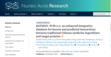 2023年10月,河北大學(xué)生命科學(xué)學(xué)院2020級(jí)生命科學(xué)鳳凰班本科生程美琪,以共同第一作者身份在《Nucleic Acids Research》(最新影響因子為14.9)發(fā)表論文“BATMAN-TCM 2.0: an enhanced integrative database for known and predicted linkages between traditional Chinese medicine ingredients and target proteins”,成為繼2018級(jí)孔祥任、2019級(jí)瞿英杰之后,第三位在國(guó)際期刊發(fā)表高水平論文的生命科學(xué)鳳凰班本科生,鳳凰班本科生梅志君、李向東、劉鵬為該論文的共同作者。該項(xiàng)工作由河北大學(xué)生命科學(xué)學(xué)院同國(guó)家蛋白質(zhì)科學(xué)中心(北京)聯(lián)合開(kāi)展,生命科學(xué)學(xué)院是第三署名單位。這是生命科學(xué)學(xué)院與國(guó)家蛋白質(zhì)科學(xué)中心科教結(jié)合、協(xié)同育人的又一重要成果。