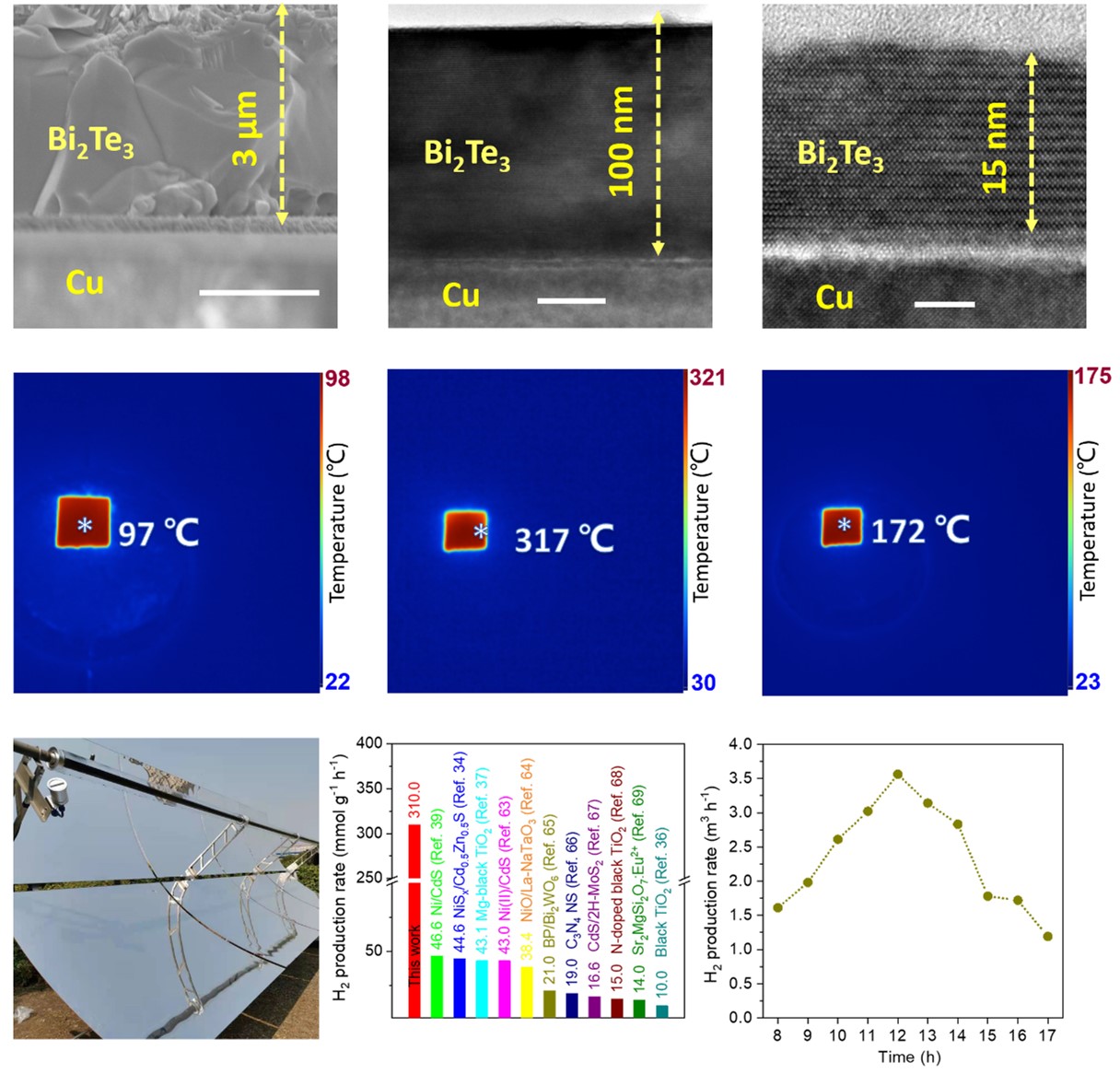 太陽光熱催化能夠不依賴人工能源運行,但光熱材料受制于室外太陽光輻照溫度過低的限制,使得自然光熱催化難以實現。在該項工作中,李亞光等人提出了利用黑色光熱材料(如Bi2Te3)和紅外反射材料(Cu)構成異質結構來提升光熱材料光熱溫度。結果表明:Bi2Te3/Cu異質結構能夠實現89%的太陽光譜吸收和5%的紅外耗散,使得標準太陽光輻照下的Bi2Te3的溫度從93 °C提高到317 °C。且該策略通用于各種光熱材料(如Ti2O3、Cu2Se和Cu2S等)。此外,以Bi2Te3/Cu為基礎的新型光熱系統在標準太陽光輻照下能夠將CuZnAl二維催化劑加熱至305 °C,使得驅動甲醇重整制氫速率達到310 mmol g-1h-1,太陽能到氫能的轉化效率達到30.1%。同時,該課題組還制備了6 m2的規?;鉄峒状贾卣茪湎到y,在春季的室外太陽光輻照下單天產氫量為23.27 m3,顯示出能夠直接工業化應用的潛力。