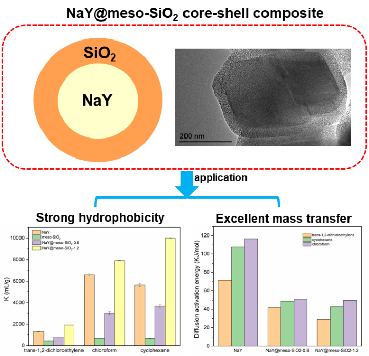 Y沸石因其高比表面積和獨(dú)特的微孔通道而被認(rèn)為是一種很有前途的VOCs吸附劑。然而,Y沸石具有強(qiáng)親水性,用于吸附VOCs時(shí)氣流中含有的水蒸氣可能與VOCs發(fā)生競(jìng)爭(zhēng)作用從而大大降低其吸附性能。此外,Y沸石具有均一微孔結(jié)構(gòu),吸附VOCs時(shí)擴(kuò)散速率也會(huì)受到限制。本研究用疏水性的介孔SiO2包覆NaY沸石合成了核殼復(fù)合材料NaY@meso-SiO2。該材料具有優(yōu)異的疏水性,在含濕條件下對(duì)VOCs表現(xiàn)出良好的吸附性能,此外,介孔結(jié)構(gòu)的外延生長(zhǎng)也顯著促進(jìn)了VOCs在復(fù)合材料上的吸附擴(kuò)散。該研究為提高NaY沸石的疏水性和擴(kuò)散性用于高效去除VOCs開(kāi)辟了一條有前景的途徑。