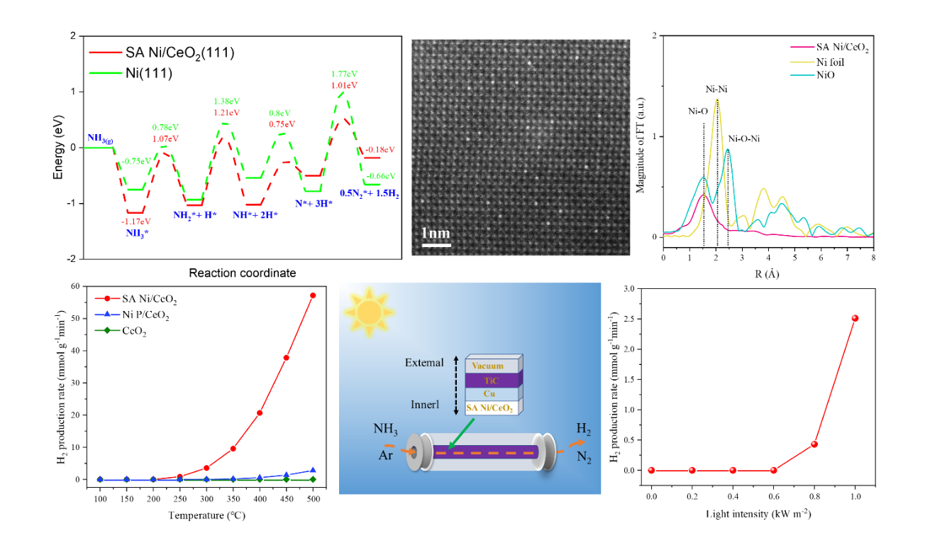 NH3催化裂解制氫是構建零碳氫能系統的基礎技術之一,以鎳元素為代表的非貴金屬材料是NH3裂解制氫的主要催化劑。雖然人們已經設計了多種非貴金屬催化劑,但其NH3裂解制氫反應仍然需要較高的溫度(600-850 ℃),阻礙了NH3裂解制氫的廣泛應用。該項工作中,李亞光等人聯合葉金花教授、張志波博士通過理論計算預測鎳單原子可以改變鎳催化劑與NH3的鍵合模式,從而提高鎳催化劑的NH3裂解活性。根據理論結果,研究團隊利用溶膠-凝膠法合成了Ni單原子/CeO2二維材料(SA Ni/CeO2),在300 ℃的低溫下展現出優異的NH3催化裂解性能,其H2產率為3.544 mmol g-1min-1,優于所有的非貴金屬催化劑和大多數貴金屬催化劑。將SA Ni/CeO2與課題組自制的光致熱器件相結合,在一個標準太陽光輻照下,SA Ni/CeO2的NH3催化裂解產氫速率達到1.58mmol g-1min-1,是目前已報道的自然太陽光驅動NH3催化裂解制氫記錄速率的100倍以上,顯示出在零碳氫能源系統中實際應用的潛力。