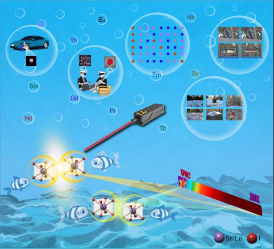 鑭系摻雜應(yīng)力發(fā)光材料因其獨(dú)特的力—光轉(zhuǎn)換特性而備受關(guān)注。現(xiàn)有體系的應(yīng)力發(fā)光范圍主要集中在380–1540nm波段,僅略微延伸至紫外區(qū)域,這限制了它們?cè)谌彰こ上瘛o(wú)背景追蹤、隱蔽通信、緊急指示與救援等領(lǐng)域的應(yīng)用。為解決這一難題,研究團(tuán)隊(duì)基于在紫外—尤其是深紫外領(lǐng)域內(nèi)的多年探索與積累,通過(guò)分析基質(zhì)影響下Pr3+的復(fù)雜能級(jí)結(jié)構(gòu),建立了遠(yuǎn)紫外C波段應(yīng)力發(fā)光的通用設(shè)計(jì)準(zhǔn)則。基于此,團(tuán)隊(duì)開發(fā)出一類Pr3+摻雜SrF2樣品,借助Pr3+的5d→4f躍遷,實(shí)現(xiàn)了中心波長(zhǎng)約為222 nm的遠(yuǎn)紫外C波段應(yīng)力發(fā)光。此外,SrF2基質(zhì)還對(duì)多種鑭系離子發(fā)光中心(Ce3+、Nd3+、Sm3+、Eu2+/3+、Gd3+、Tb3+、Dy3+、Ho3+、Er3+、Tm3+和Yb3+)表現(xiàn)出包容性,均實(shí)現(xiàn)了應(yīng)力發(fā)光效果,覆蓋了200–1700 nm全光譜范圍。考慮到太陽(yáng)光中的紫外C成分已被臭氧層完全吸收,研究團(tuán)隊(duì)展示了所設(shè)計(jì)的遠(yuǎn)紫外C應(yīng)力發(fā)光體系在無(wú)背景標(biāo)記、結(jié)構(gòu)健康監(jiān)測(cè)等方面的潛在應(yīng)用。