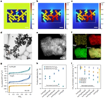 我國具有十分豐富的頁巖氣資源,已探明可采儲量居全球第一。在清潔能源驅動下,將頁巖氣的主要成分甲烷高效、高選擇性催化轉化為高附加值碳氫化合物對于實現碳資源高值化利用意義重大。然而,傳統甲烷光催化氧化偶聯工藝面臨甲烷轉化率低、反應穩定性差等問題,且產物主要為氣態乙烷,儲運成本相對較高。基于此,郝宇晨博士、葉金花教授等人開發出一種多孔二氧化鈦封裝金納米顆粒的新型光催化劑,通過蒸汽活化策略,在太陽光照射下實現甲烷高選擇性氧化偶聯制備丙烷,產率和選擇性分別高達1.4毫摩爾每小時和91.3%,性能顯著優于已報道催化體系。此外,相比于氣態乙烷產物,丙烷可在常溫下實現液化,從而顯著降低了儲運成本。機理研究表明,蒸汽活化能夠使金納米顆粒表面產生晶格拉伸應變,改變其電子結構,從而增強對反應中間體的吸附,促進甲烷深度偶聯為丙烷。同時,多孔二氧化鈦框架內的納米限域催化微環境能夠有效延長反應中間體停留,從而進一步提高甲烷深度偶聯效率。本研究為頁巖氣資源的高效、高附加值利用提供了新策略,對推動光驅動甲烷轉化技術發展具有重要意義。